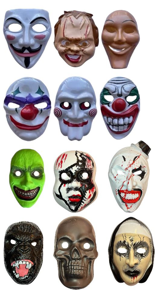 Opciones | Calavera, Dracula, Jason, Kiss me hombre, Kiss me mujer, Zombie real, Zombie fluor, Cross, Calaca, Monja, Payaso terror, Scream, Chucky, Clown, Vendetta, Saw, Pirata, Purga hombre, Purga mujer, Dark dorada, Dino, Fluo mujer, Frankestein, Freddy, Hombre lobo, Diablo, Bruja, Anonimous, Calabaza, Mujer fluo, Batman, Guason, Espectro fluo, Payaso IT, Payaso Terrifier, Gorila, Bebe terror, Calavera black, Venom, Scream con lengua |